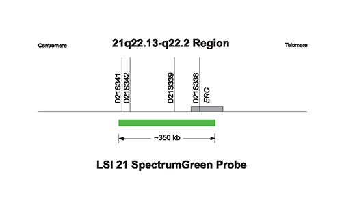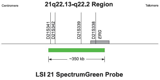 Analysis of an uncultured amniocyte (sometimes referred to as direct analysis) hybridized with the AneuVysion 18/X/Y probe set. Three aqua signals indicate three copies of chromosome 18, one green signal indicates one copy of the X chromosome and one orange signal indicates one copy of the Y chromosome.